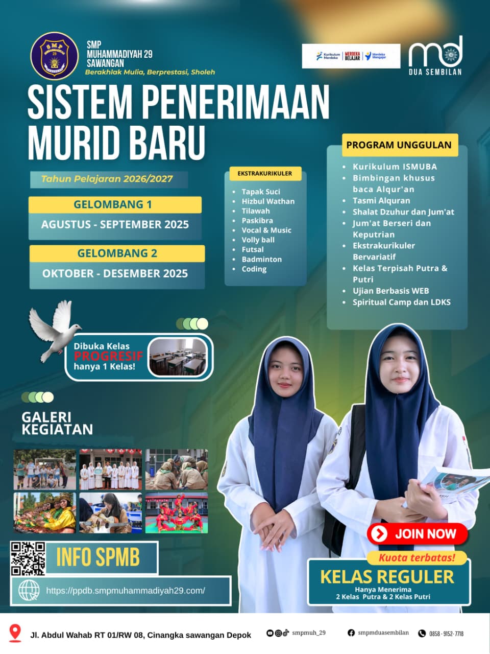 SMP Muhammadiyah 29 adalah salah satu institusi pendidikan terakreditasi "A" yang berlokasi di Jl. Abdul Wahab No.29 Cinangka Sawangan Depok. Memiliki komitmen kuat untuk menghasilkan lulusan yang berprestasi dan berkarakter. Berdiri sejak 1985, SMP Muhammadiyah 29 memiliki reputasi sebagai sekolah yang tidak hanya mengedepankan prestasi akademik tetapi juga pengembangan potensi non-akademik dan juga nilai-nilai keagamaan para siswa.